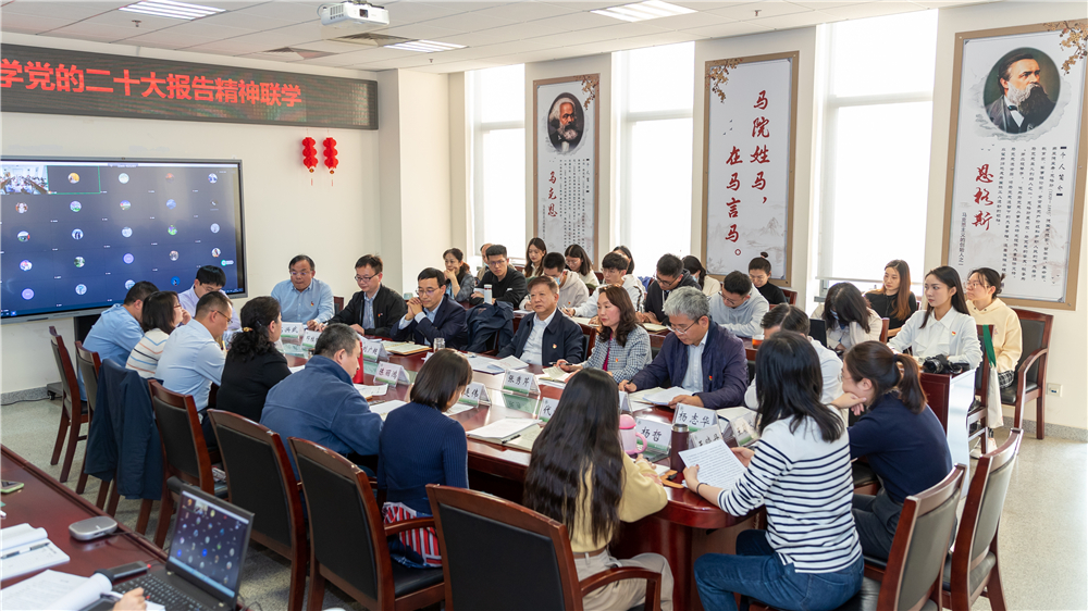 10月19日,馬克思主義學院組織開展黨的二十大精神聯學,校黨委書記王洪元以普通黨員身份參加,并指導學院開展黨的二十大精神學習宣傳貫徹工作。學院黨委委員、班子成員、全體教師和馬克思主義理論研究生宣講團成員參會。